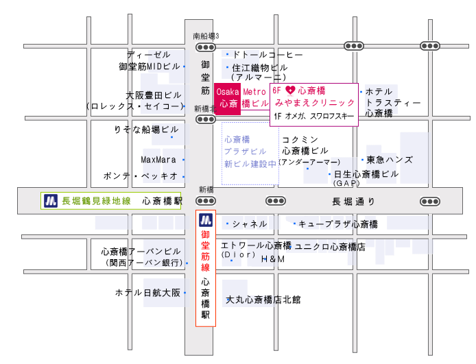 心斎橋駅から徒歩1分、こちらの Osaka Metro 心斎橋ビルの6F に当院はあります。 |
